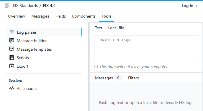 The FIX parser provides a human-readable view of raw FIX messages extracted from log files. It can be accessed via the Tools tab of a FIX spec, and selecting Log parser on the left-hand sidebar.